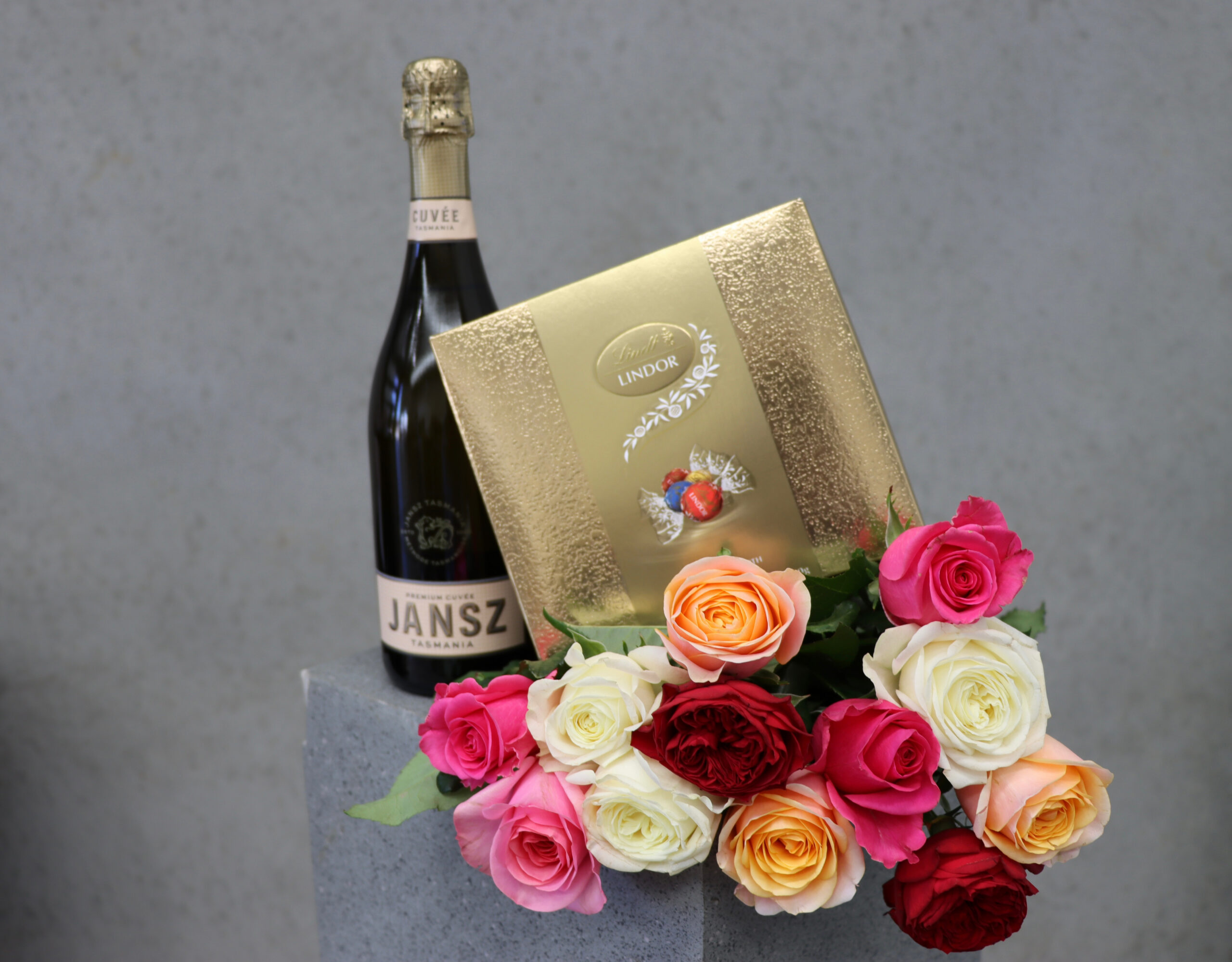 Twelve stunning mixed colour roses and a bottle of our fave bubbles from JANSZ in beautiful Tasmania.